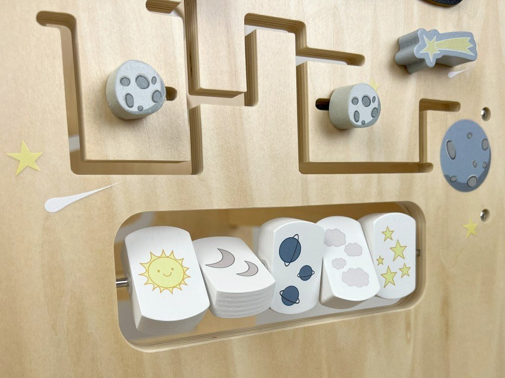 - Az egyik oldalon található játékelemek - egy bolygó alakú rajztábla, egy térlabirintus és forgó számtáblák lehetőséget nyújtanak a gyerekeknek a játékra, rajzolásra, írásra és tanulásra.