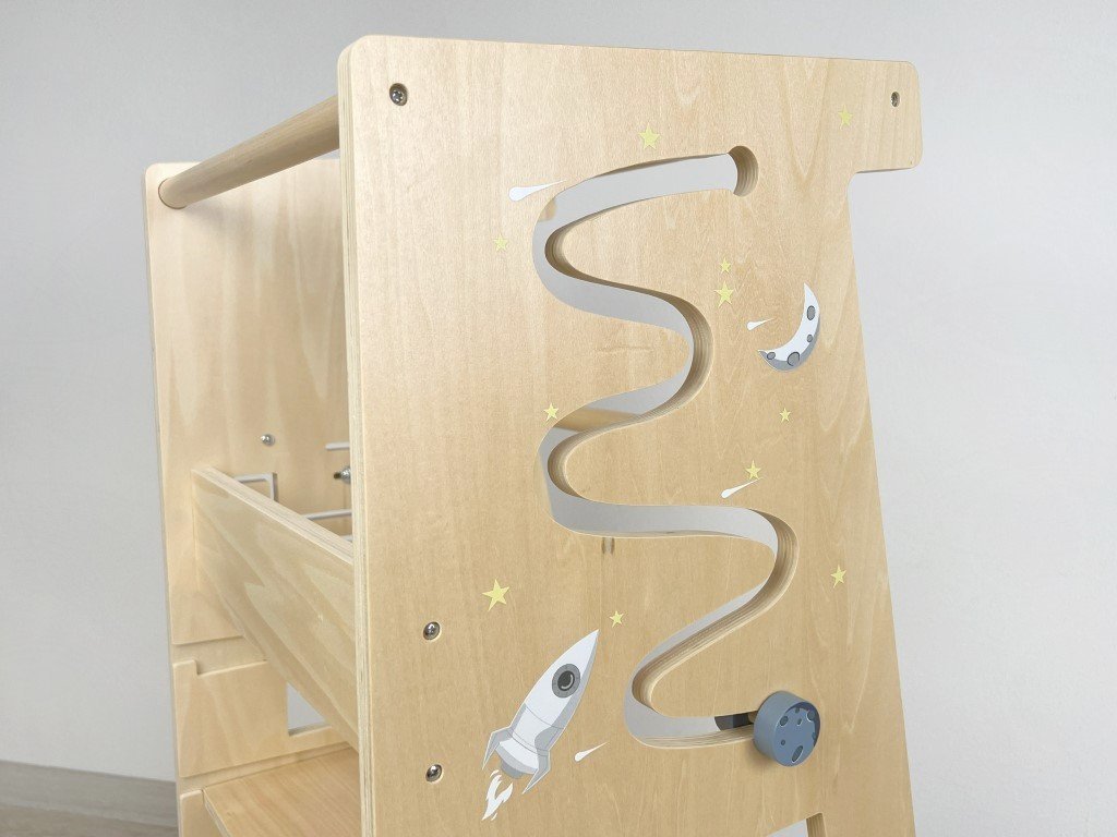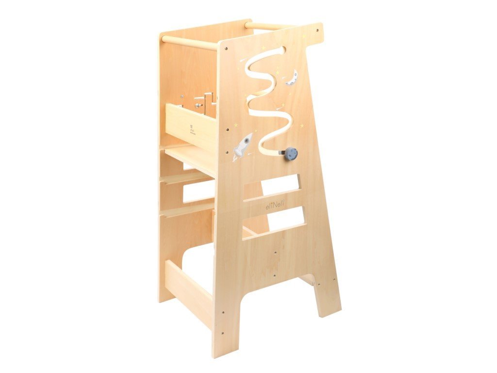 Ez a sokoldalú segédeszköz könnyen átalakítható gyermekasztallá és -székké, ahol a gyerekek alkothatnak és falatozhatnak. Egyszerűen döntse a növekvő tanulótornyot a hátára és helyezze át a deszkát, amelyen a gyerekek a tanulótoronyban állnak. A platform asztallapként szolgál. A tanulótorony két oldala a 4 játékelemmel szórakozási és tanulási lehetőséget nyújt a gyerekeknek. Az egyik oldalon a gyerekek egy menő világűr golyópályát találnak, a másik oldalon pedig egy rajztáblát, egy labirintust és számokkal ellátott forgó táblákat.