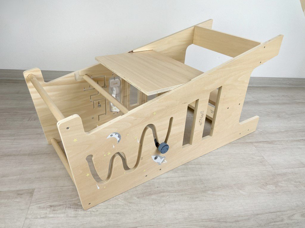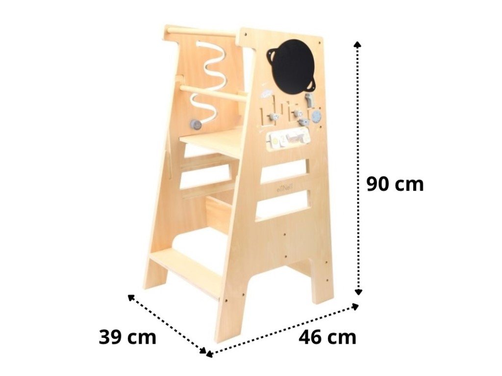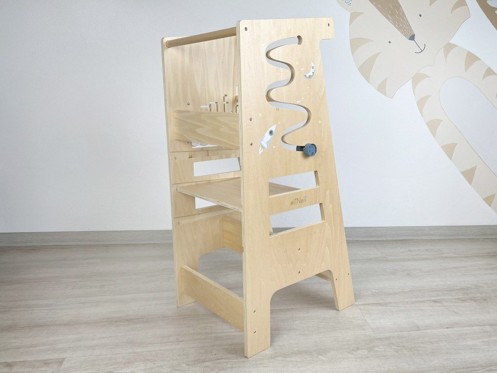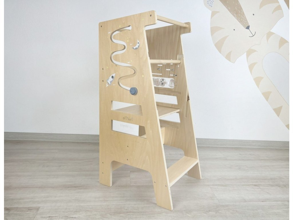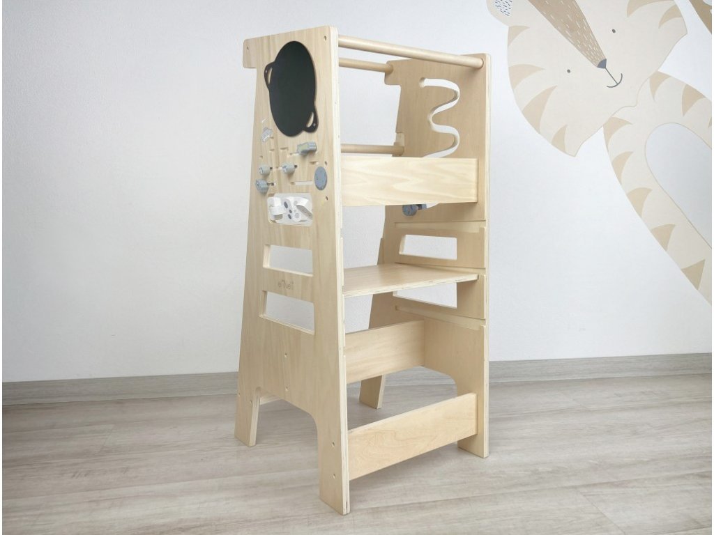 - Multifunkcionális (5 az 1-ben) - tanulótorony, lépcső, gyermekbútor szett (szék asztallal), játék (tábla, labirintus, forgó elemek, golyós pálya).