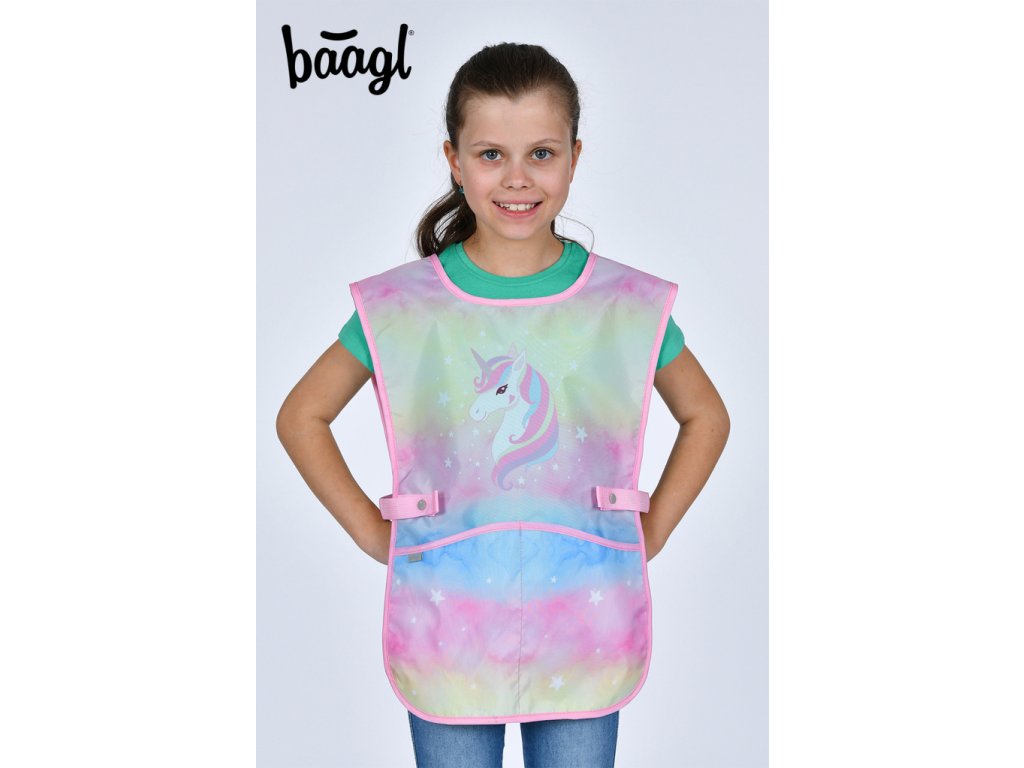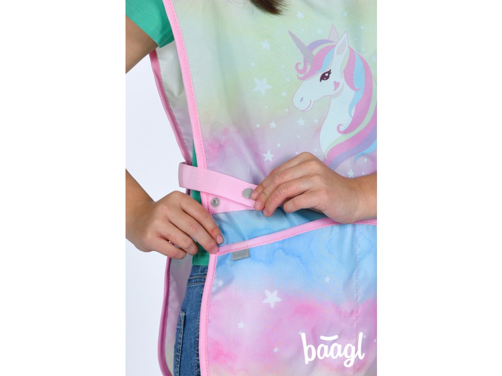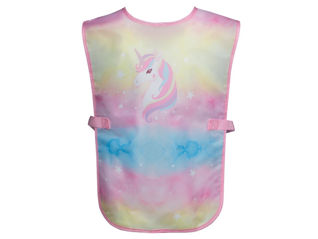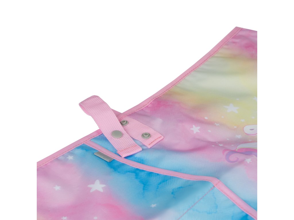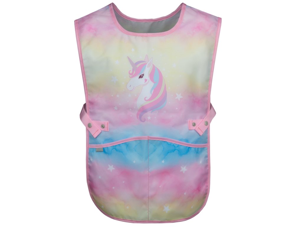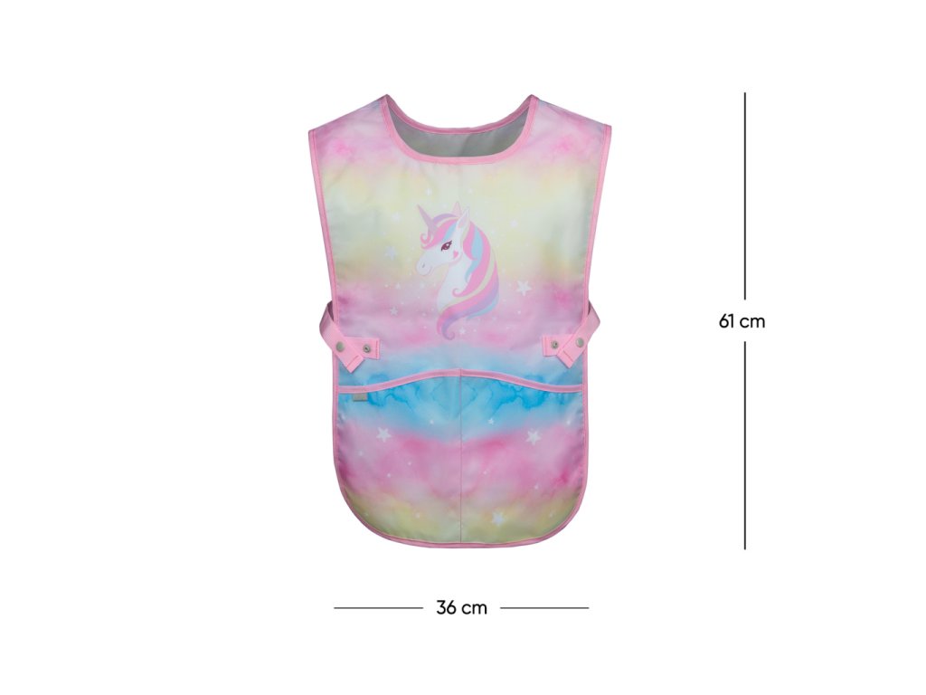 A gyakorlati foglalkozásokon vagy a kézműves órákon viselt ruháit könnyedén megvédheti egy praktikus kötény, amelyen kedvenc egyszarvú motívuma látható. A szivárvány színekben pompázó gyermek kötény állítható pánttal rendelkezik, amelynek köszönhetően könnyen igazítható a gyermek aktuális magasságához, valamint két praktikus zsebbel rendelkezik az alsó részén. Kiváló minőségű, mosható anyagból készült, így tisztítása egyszerű.