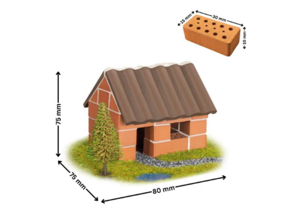 Kreativní sada obsahuje skutečné cihličky z pravé hlíny, speciální maltu, nářadí i návod - vše, co malý stavitel potřebuje ke stavbě malého domečku. Jednoduché stěny a šikmá střecha z vlnitých panelů se snadno realizují, sada je ideální pro začátečníky v zednickém umění. Výsledkem je útulný malý domek, který pod rukama doslova ožívá cihlu po cihle.
