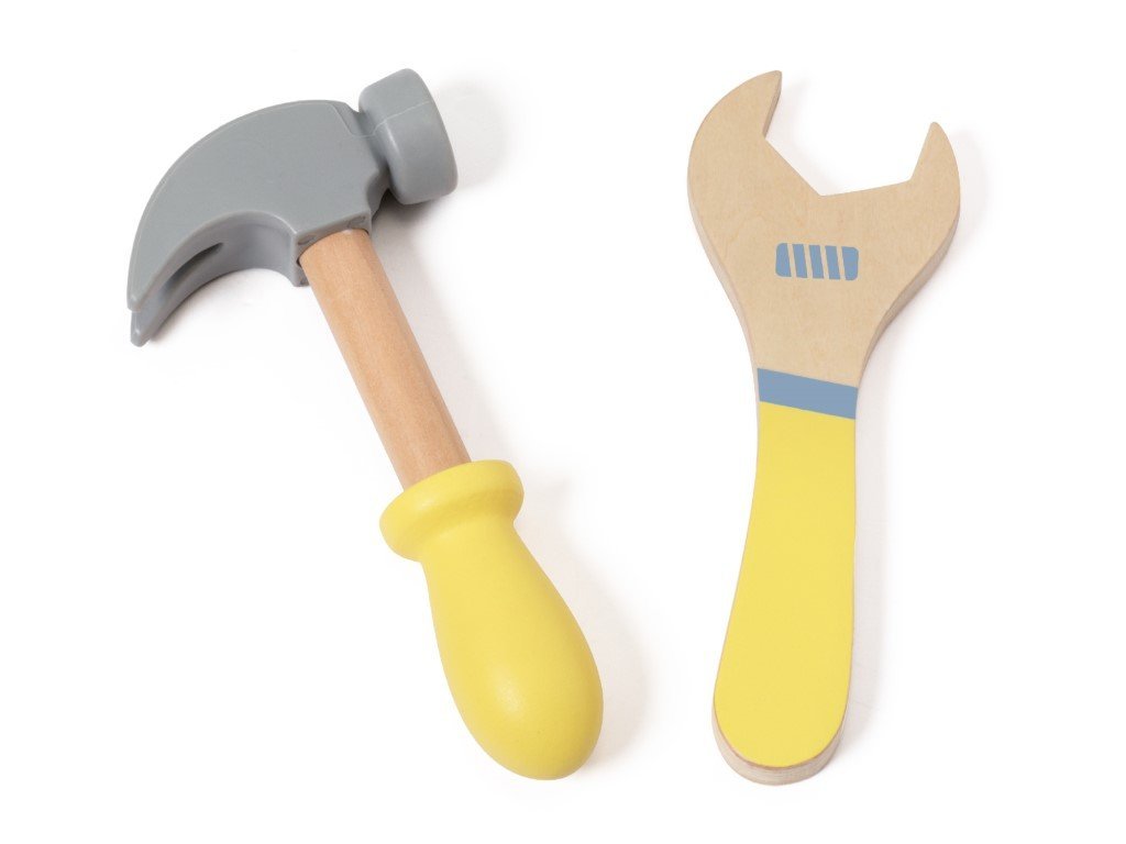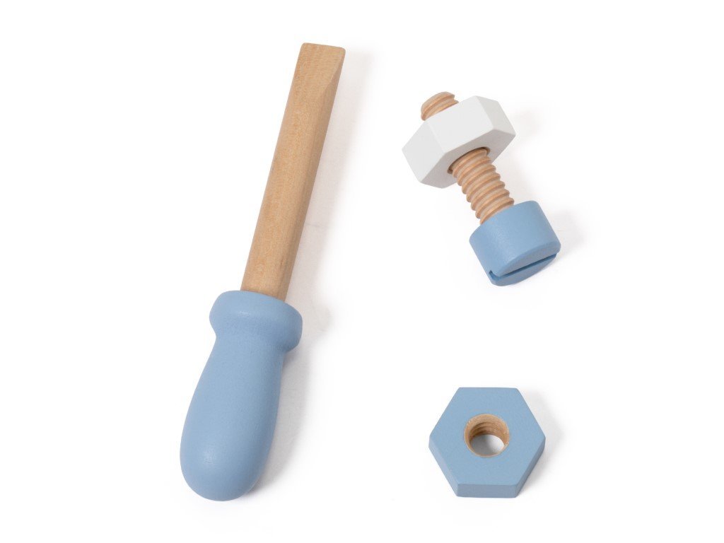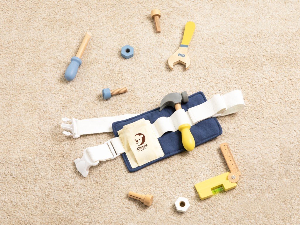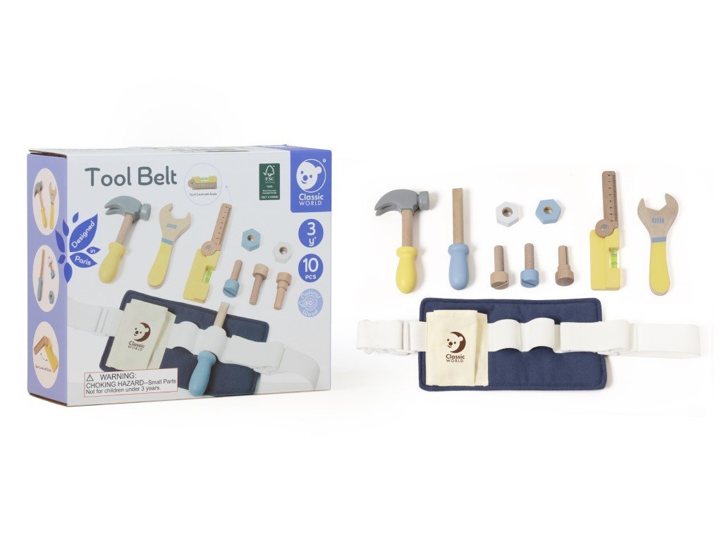 A fából készült gyermekszerszámokat tartalmazó övnek köszönhetően a gyerekek mindig kéznél (a derekukon) lesznek a kisebb javításokhoz és barkácsoláshoz szükséges szerszámaik. A fából készült kalapáccsal, csavarhúzóval, összecsukható mérőszalaggal, vízmértékkel, csavarkulccsal, csavarokkal és anyákkal igazi szerelőnek fogják magukat érezni, és szívesen segítenek majd mindenben, amit otthon meg kell javítani. A gyerekszerszámkészlet az övnek köszönhetően könnyen hordozható. A fából készült szerszámokkal a gyerekek nemcsak otthon, hanem a barátoknál vagy a nagymamánál tett látogatáskor is játszhatnak, barkácsolhatnak és javíthatnak. A fából készült szerszámok fejlesztik a motorikus készségeket, a kézügyességet, ösztönzik a kreativitást, a képzelőerőt, a gyerekek szerepjátékot játszanak és kipróbálhatják a felnőttek tevékenységeit szórakoztató, gyermekbarát és mindenekelőtt biztonságos módon.