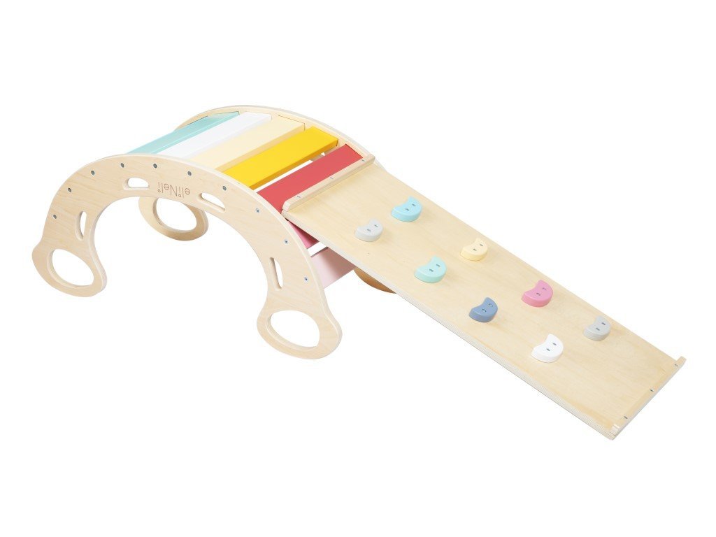 - Kétoldalas rámpa - a készletben található táblával a gyerekek sportolhatnak és szórakozhatnak. Az egyik oldal egy szórakoztató csúszda, a másik oldal pedig egy mászófal a mászáshoz. A pasztellszínekben pompázó fogantyúk edzik az ujjakat és erősítik az izmokat.