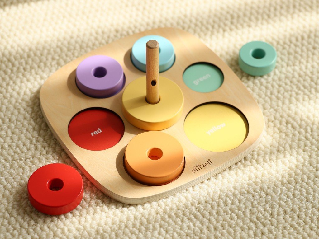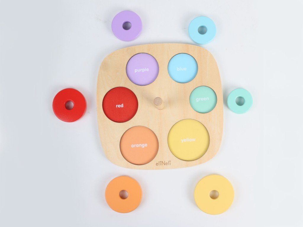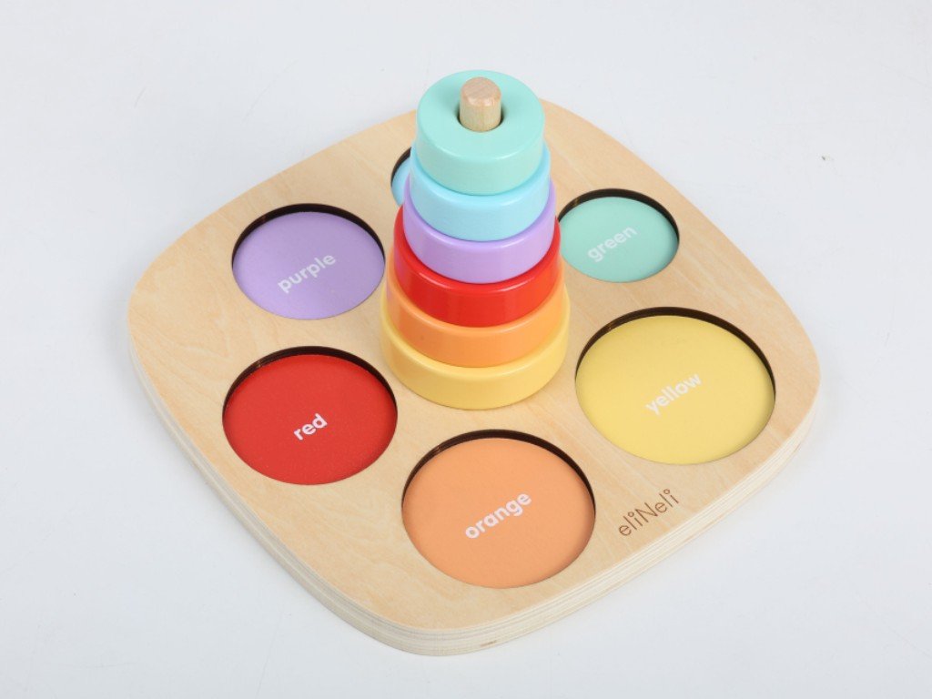 A fa kirakós és felhúzós játék egyben ideális segédeszköz a szórakoztató tanuláshoz és a gyermekek készségeinek fejlesztéséhez. A gyerekek játék közben megtanulják a színeket és megkülönböztetni a különböző méreteket. A gyűrűk felhúzásával megkezdhetik az első számolást, és játékos formában fejlesztik finom motorikus készségeiket és logikai gondolkodásukat. Itt találják meg az első angol szavakat is (a színek neveit), amelyeket könnyen megtanulnak a közös játék során.