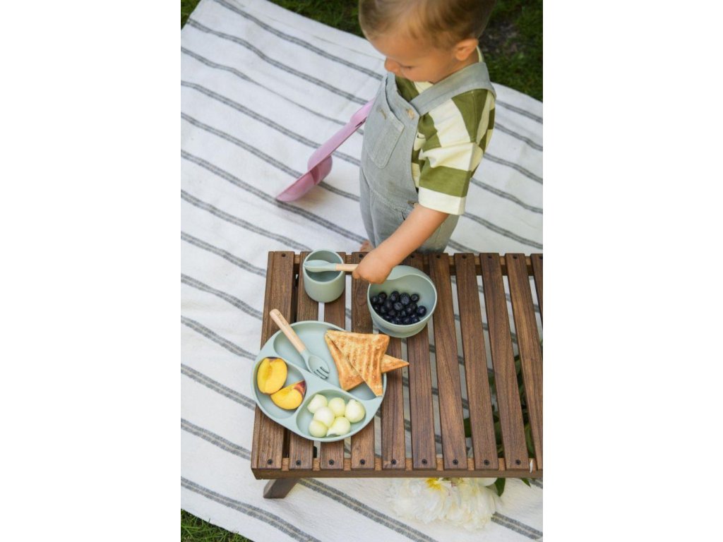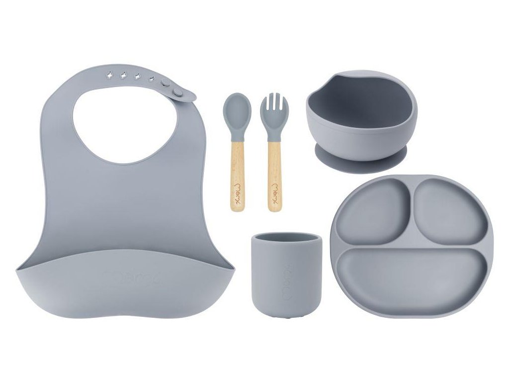 A sötét szürke szilikonból készült gyermekkészlet egy tálat és egy osztott tányért tartalmaz, amelyek praktikus tapadókoronggal vannak ellátva, így biztonságosan a helyükön maradnak az asztalon. Így nem kell attól tartani, hogy a tányér elmozdul, amikor a gyermekek evőeszközzel szednek belőle, és esetleg a padlóra esik. A szettben található még egy könnyű csésze, amely jól fogja szolgálni a gyerekeket az önálló ivás első kísérletei során, fa nyéllel ellátott evőeszközök és egy kényelmes, puha előke praktikus zsebbel, amely felfogja az összes leeső ételt és megakadályozza a szennyeződést. Az evőeszközök mérete a kis kezekhez van igazítva, így a gyerekek biztonságosan használhatják őket egyedül.A sötét szürke szilikonból készült gyermekkészlet egy tálat és egy osztott tányért tartalmaz, amelyek praktikus tapadókoronggal vannak ellátva, így biztonságosan a helyükön maradnak az asztalon. Így nem kell attól tartani, hogy a tányér elmozdul, amikor a gyermekek evőeszközzel szednek belőle, és esetleg a padlóra esik. A szettben található még egy könnyű csésze, amely jól fogja szolgálni a gyerekeket az önálló ivás első kísérletei során, fa nyéllel ellátott evőeszközök és egy kényelmes, puha előke praktikus zsebbel, amely felfogja az összes leeső ételt és megakadályozza a szennyeződést. Az evőeszközök mérete a kis kezekhez van igazítva, így a gyerekek biztonságosan használhatják őket egyedül.