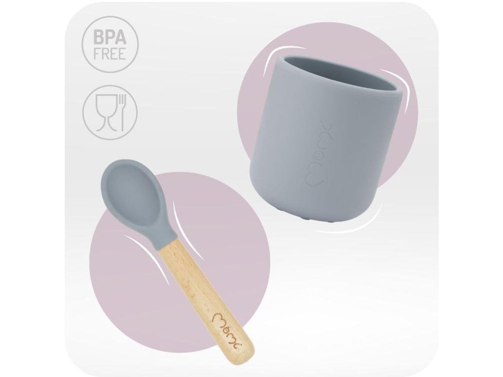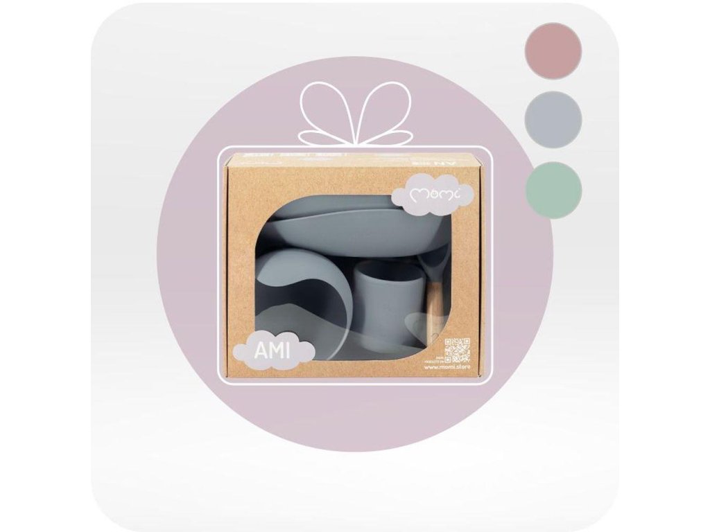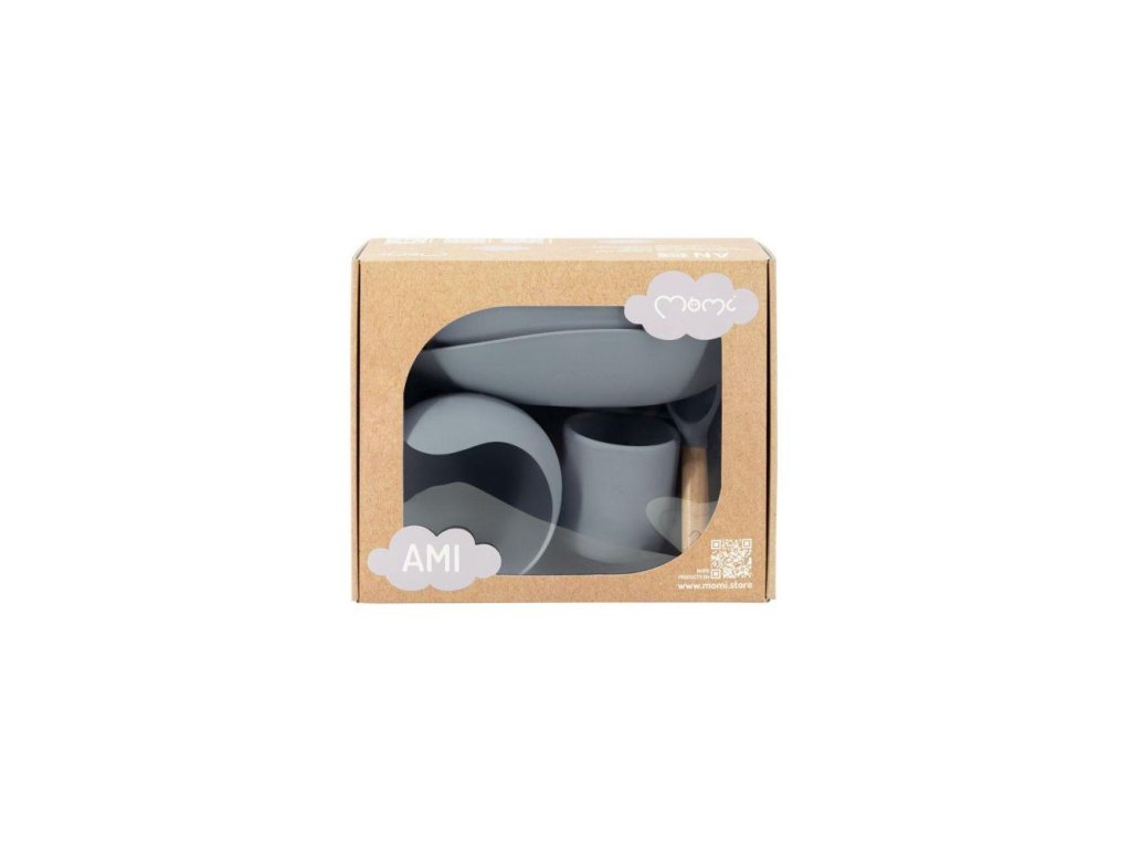 A MoMi AMI edények megemelt oldalai megkönnyítik a gyerekek számára a kanálba merést, a háromrészes tányér pedig ideális az ételek egyedi adagokra való felosztásához. Az ételeket biztonságosan felmelegítheti a mikrohullámú sütőben, a szilikon elemek pedig mosogatógépben moshatók.