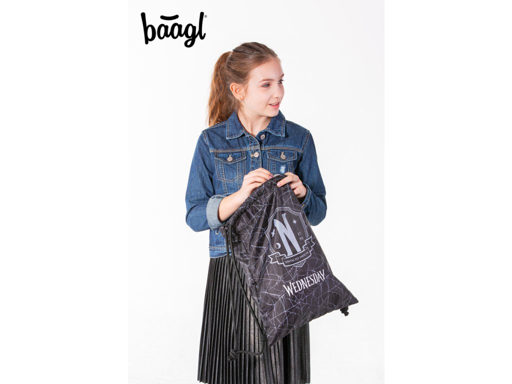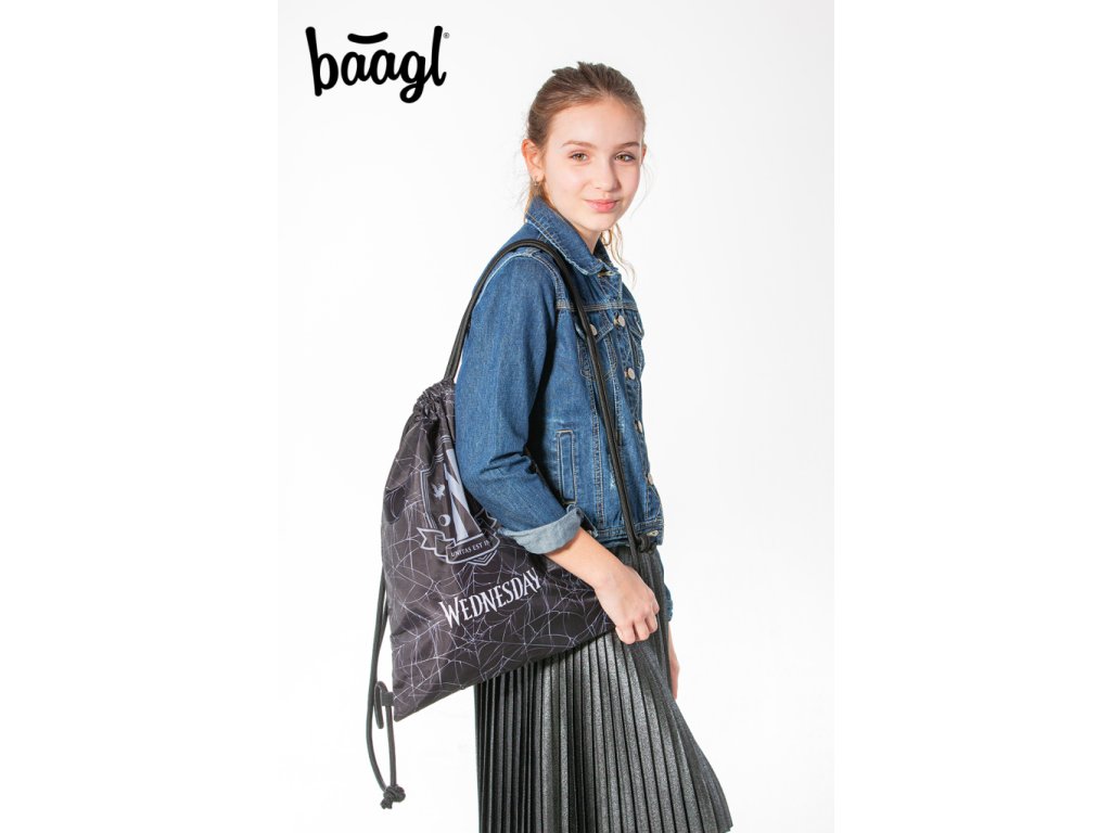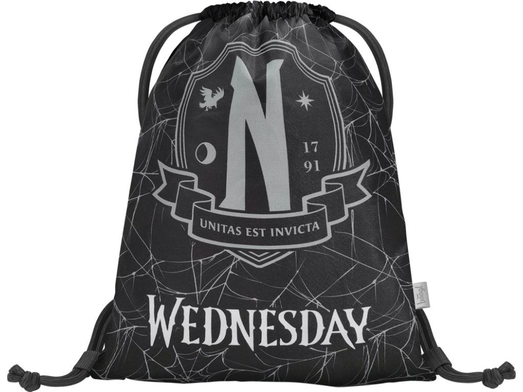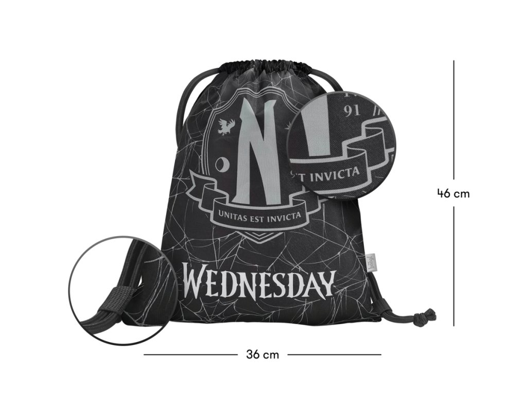 A Wednesday népszerű sorozat motívumával ellátott, húzózsinórral záródó textil cipőzsákot a gyerekek a szilárd zsinóroknak köszönhetően hátizsákként is használhatják, és például tornatermi felszerelésüket vagy különböző szabadidős tevékenységekhez szükséges eszközöket tárolhatnak benne. A szilárd, mosható anyag megkönnyíti a tisztítást.