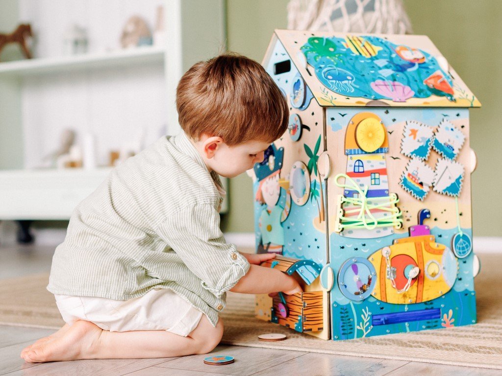A házikó hátsó része a finommotorikus készségeket edzi, a gyerekek különböző típusú rögzítéseket gyakorolnak és szórakoztató elemekkel játszanak.