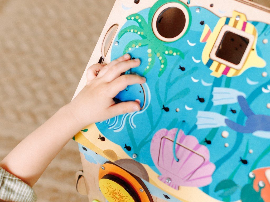 Az activity board másik oldalán a gyerekek mindennapos gyakorlati készségeket tanulnak.