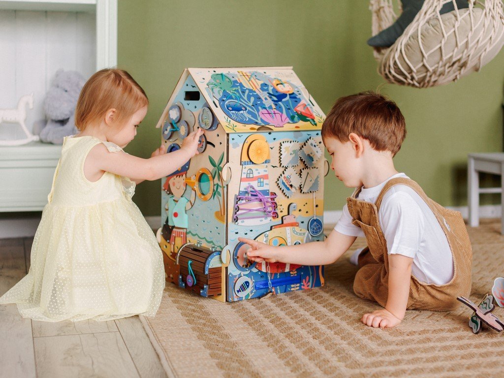 A házikó hátsó része a finommotorikus készségeket edzi, a gyerekek különböző típusú rögzítéseket gyakorolnak és szórakoztató elemekkel játszanak.