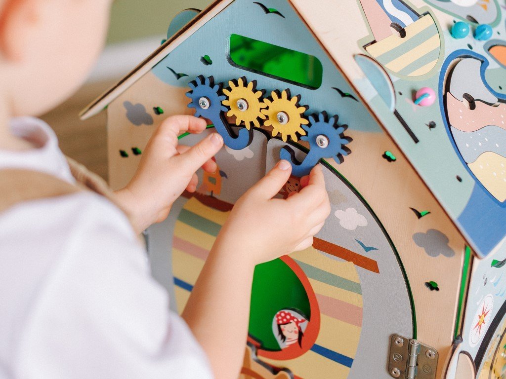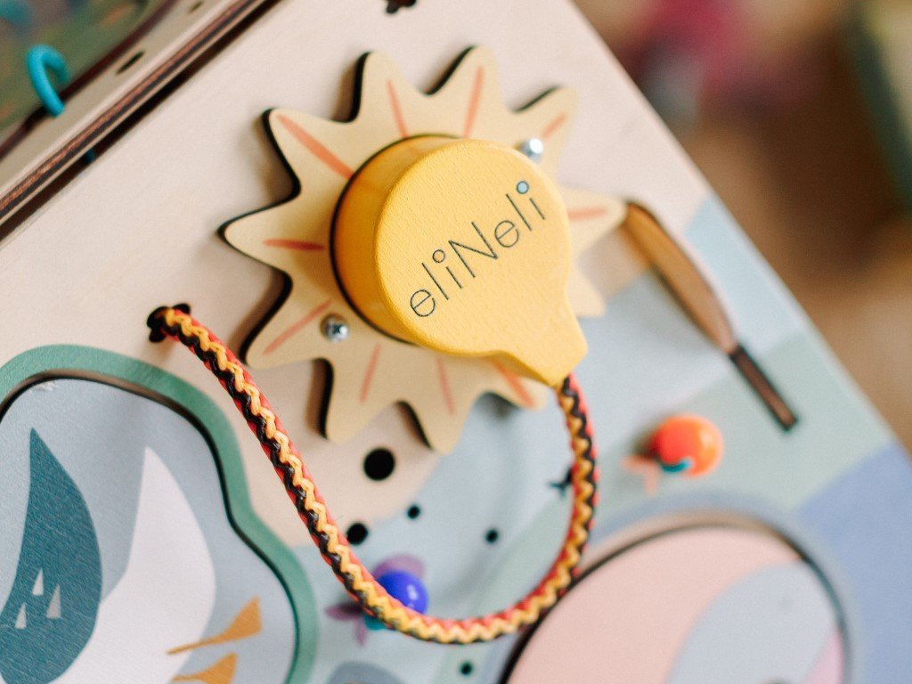 Az activity board tetején a gyerekek megtanulják felismerni a formákat és a színeket, gyakorolják a finommotorikát, a szem-kéz koordinációt, valamint türelmet és koncentrációt tanulnak.